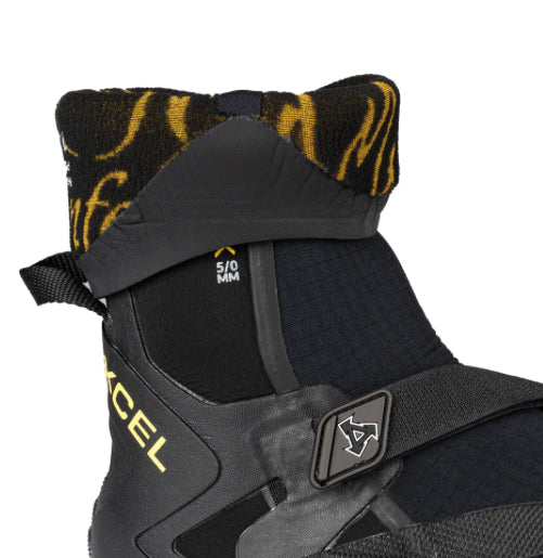 Xcel’s Drylock Boot has been updated with a sleeker design and reduced bulk. This 3-dimensional boot contours to the foot while minimizing excess rubber on the sole, providing a true board feel. The new Thermo Dry Inferno (TDI) interior and Channel Flex exterior make it extremely warm and comfortable. A Drylock Cuff opening prevents flushing, while the ergonomic strap keeps your heel locked in and relieves pressure from the instep. A heel strap also makes for easy pull-on.