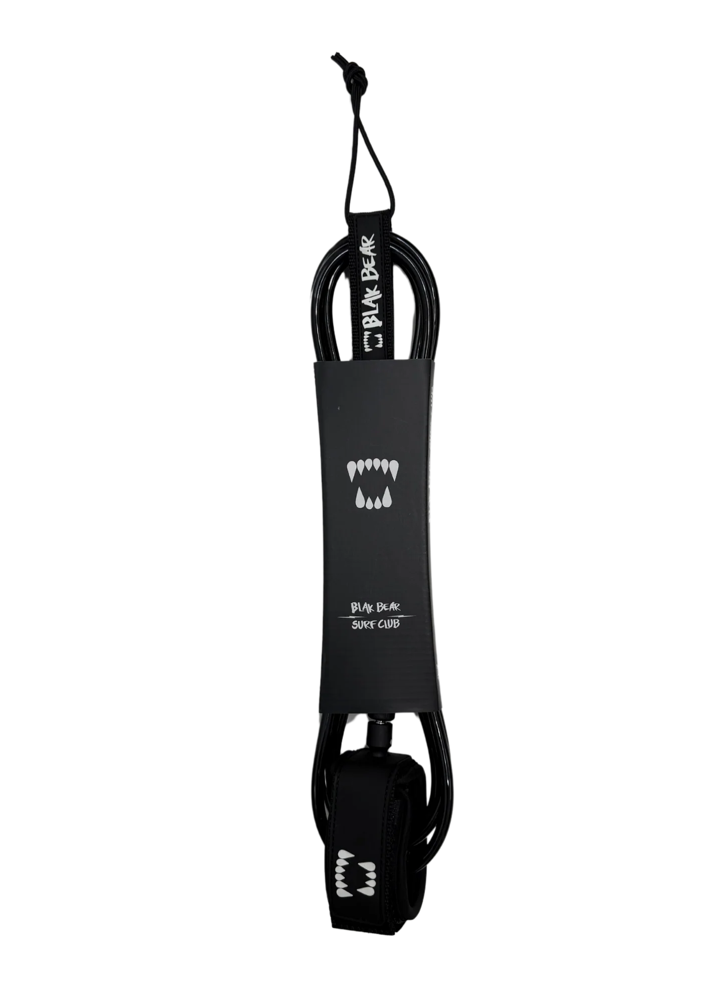 The Blak Bear Everyday Leash in 7' Black offers reliable performance with a 7mm thick cord for strength and durability. Its 2-inch wide cuff features a custom logo and a non-slip design, ensuring a secure fit during intense surf sessions. The 1-inch railsaver protects your board from leash wear, combining functionality with expert craftsmanship for everyday use.
