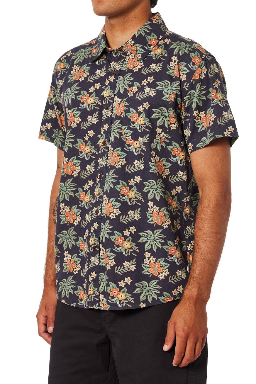 The Benji Shirt features a custom floral pattern inspired by the islands on a cotton blend fabric, perfect for any occasion.