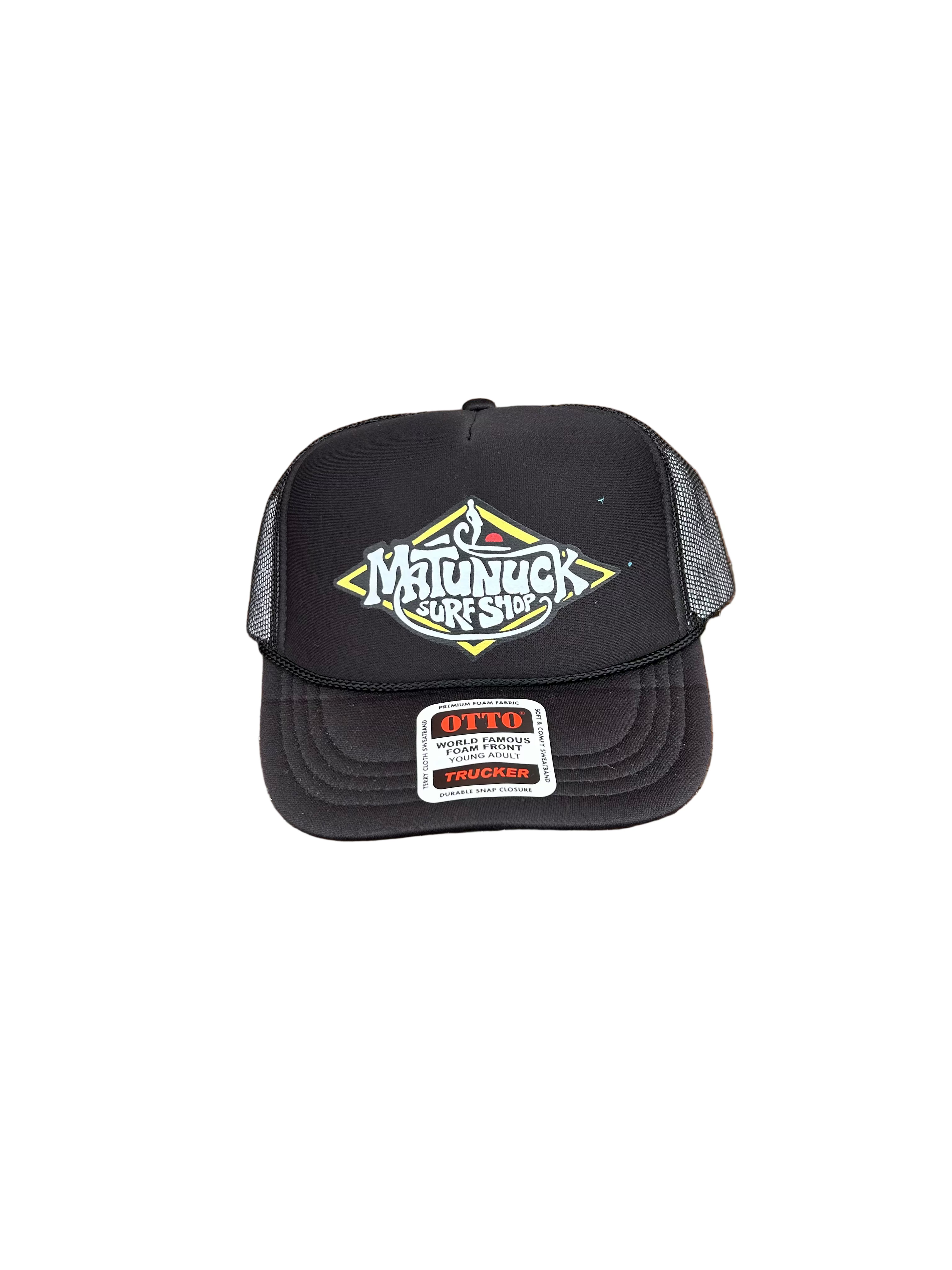 Youth black trucker hat with a Matunuck cartoon logo.