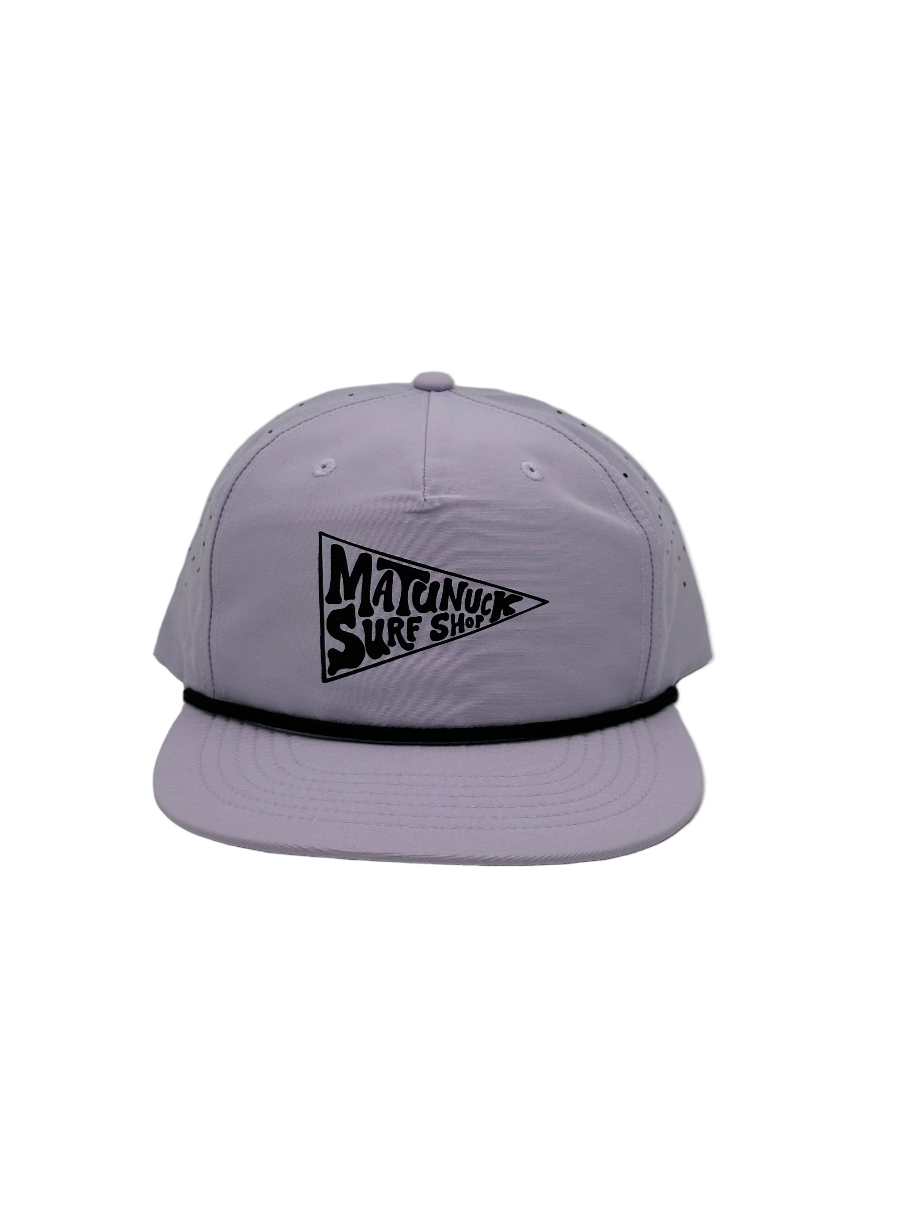 PERFORMANCE GRAMPS CUSTOM SNAPBACK - FEATURES A NYLON, MID-HEIGHT GRANDPA STRUCTURED 5 PANEL PINCH CROWN, FLAT BILL WITH A 5MM ROPE, MOISTURE WICKING PREMIUM SWEATBAND & A CLASSIC SNAPBACK.
