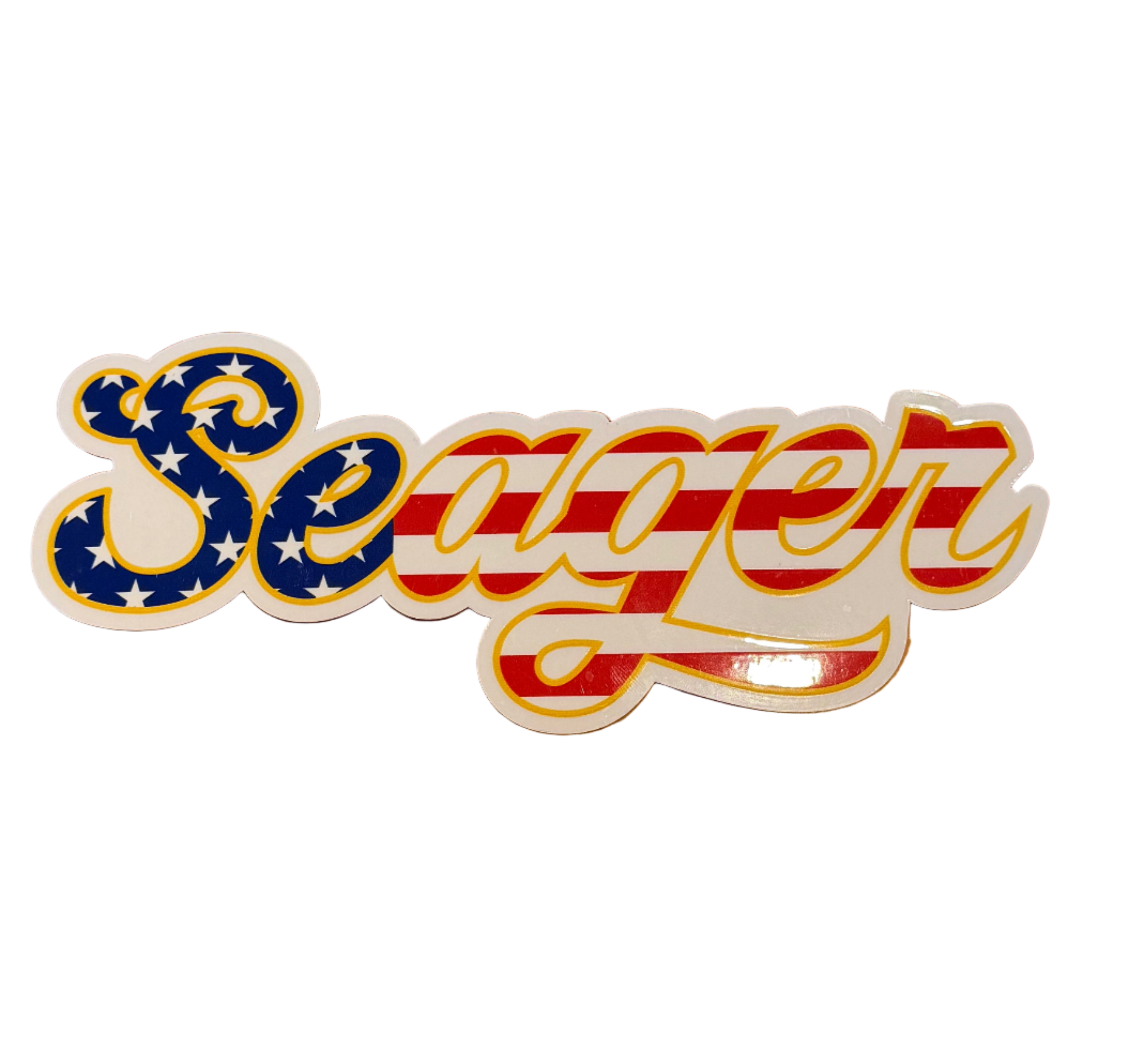 Show your patriotic pride with the Seager Font Sticker! Featuring a bold American flag fill and simple font, this sticker proudly displays the Seager brand. Perfect for adding an extra touch of USA spirit to any surface.