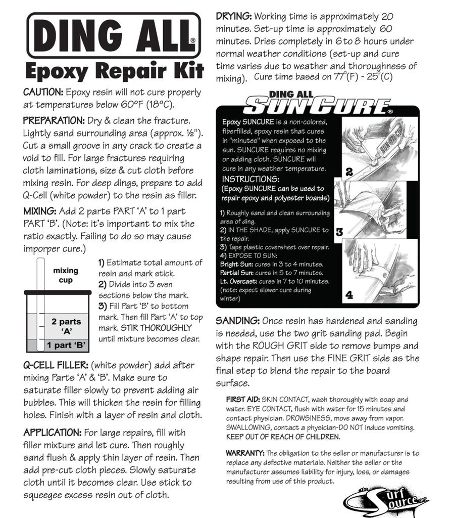 - Bonus - 1 x 1oz. SunCure Epoxy Fiberfill resin Tube. (Repairs both Poly and Epoxy, 5 Min. Cure)