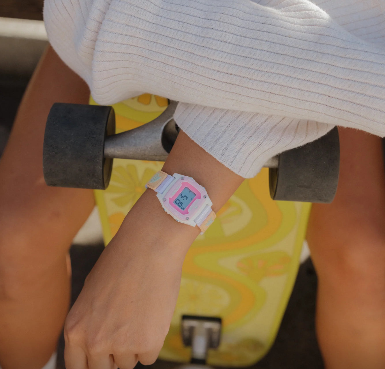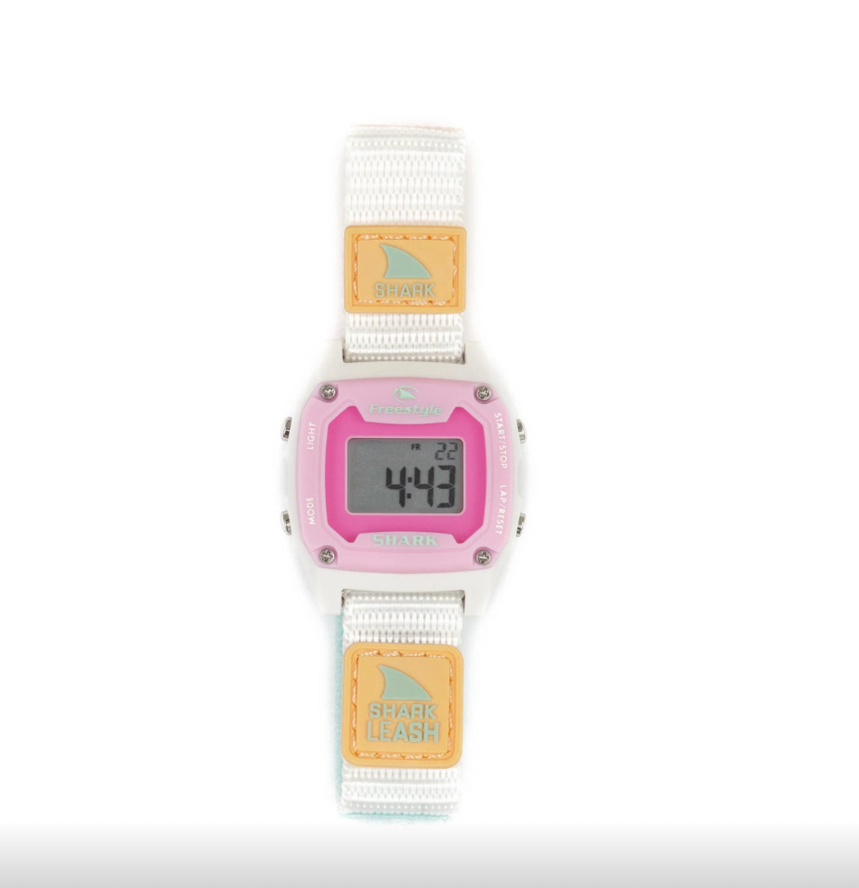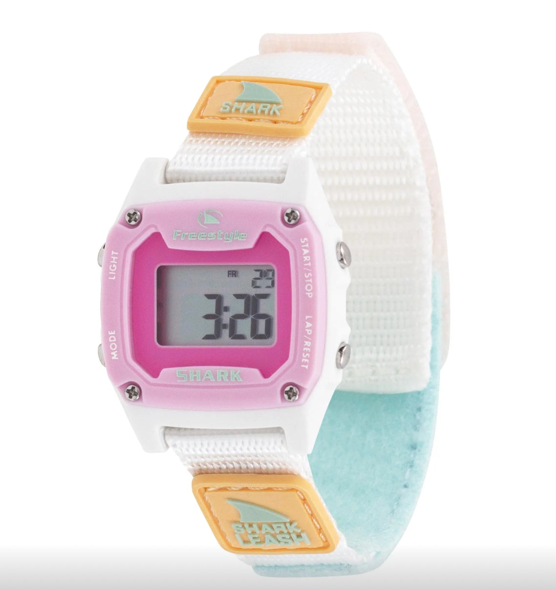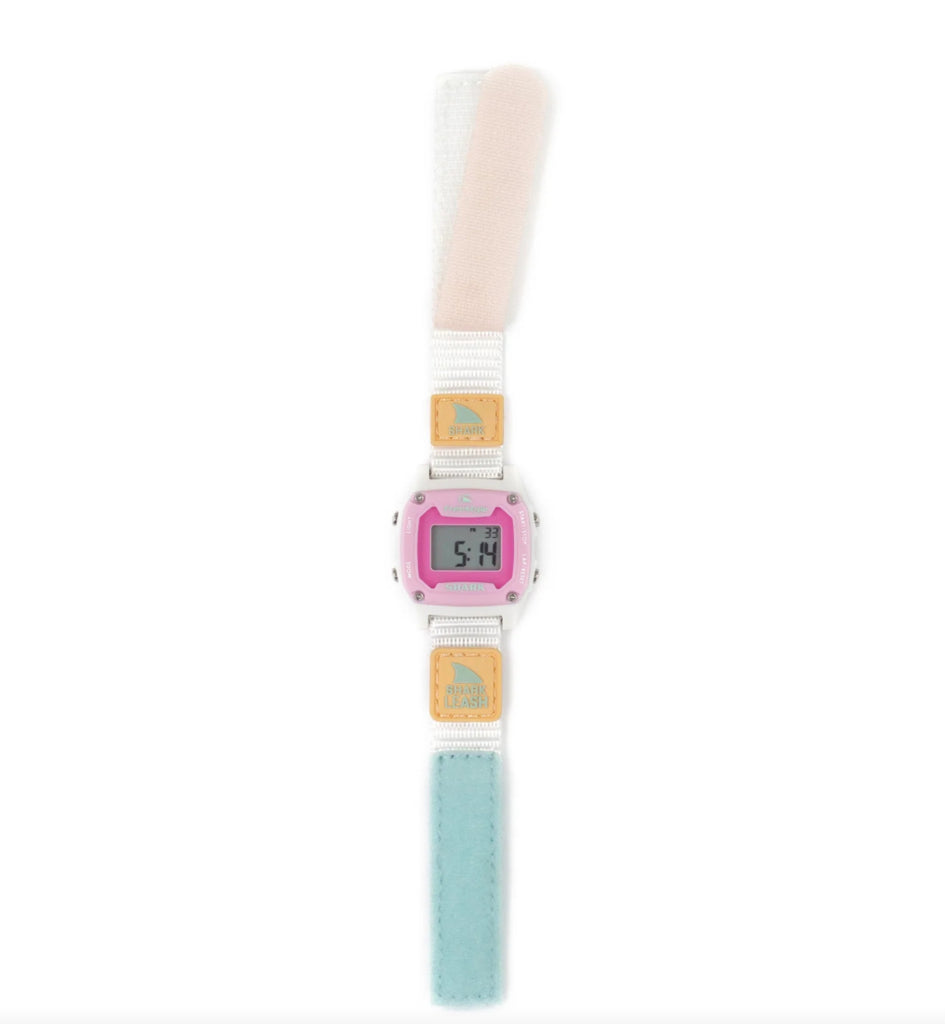 Catch waves of style with the Shark Mini Leash Blue Tie Dye, the smaller sidekick to our best-selling Shark Classic. Wrapped in mellow blue, sandy beige, soft white, and baby pink, this Mini digital water-resistant watch packs all the iconic features of the original in a compact size, perfect for smaller wrists. Just strap in and let those beachy vibes roll, no matter where you roam. Backed by our limited lifetime warranty for endless adventures.