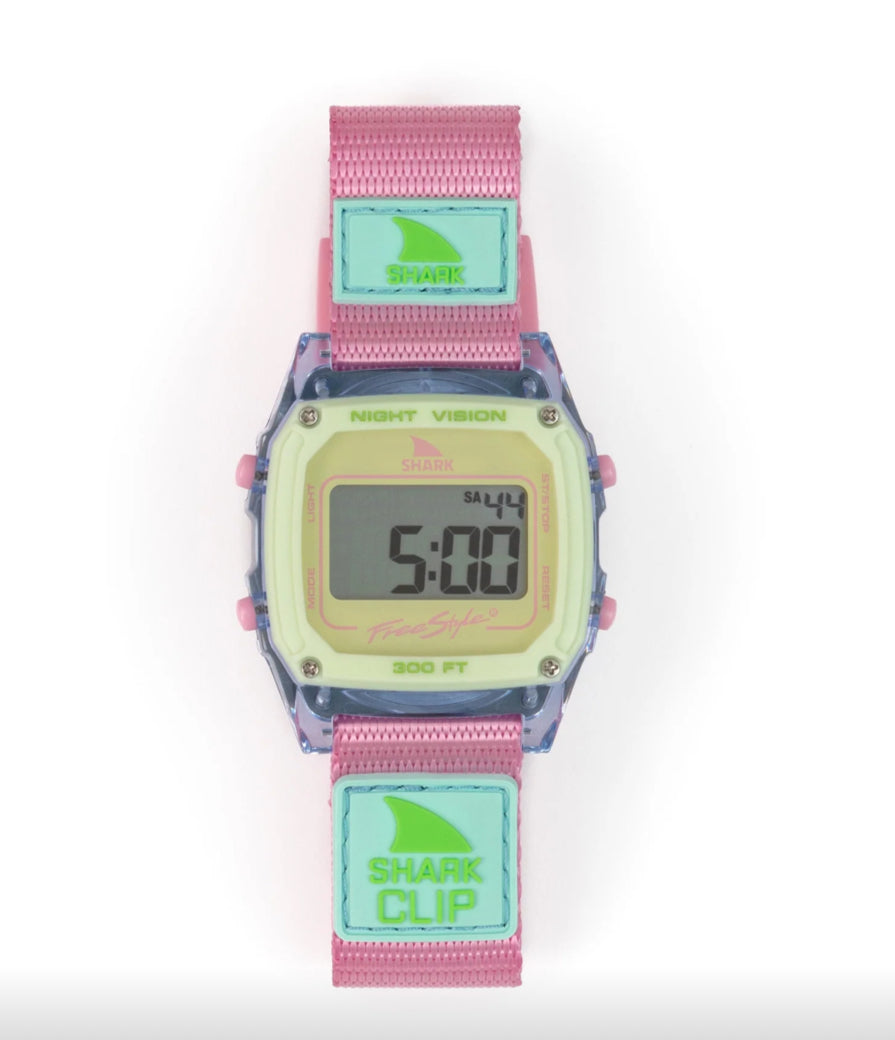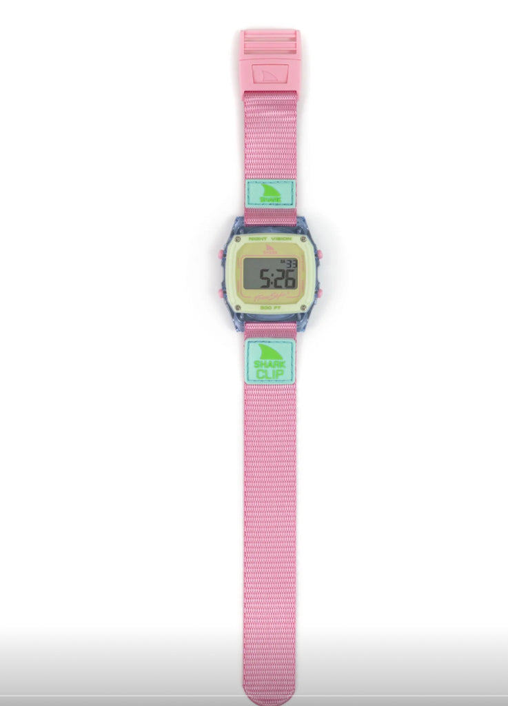 Shark Clip Berry Breeze looks like it came straight from a boardwalk candy shop. With a translucent blueberry case, soft pink strap, and neon green pops layered throughout, this pastel digital watch channels that easygoing, beach-day energy the SALT WATER TAFFY COLLECTION is all about. Sweet, simple, and just the right amount of throwback.