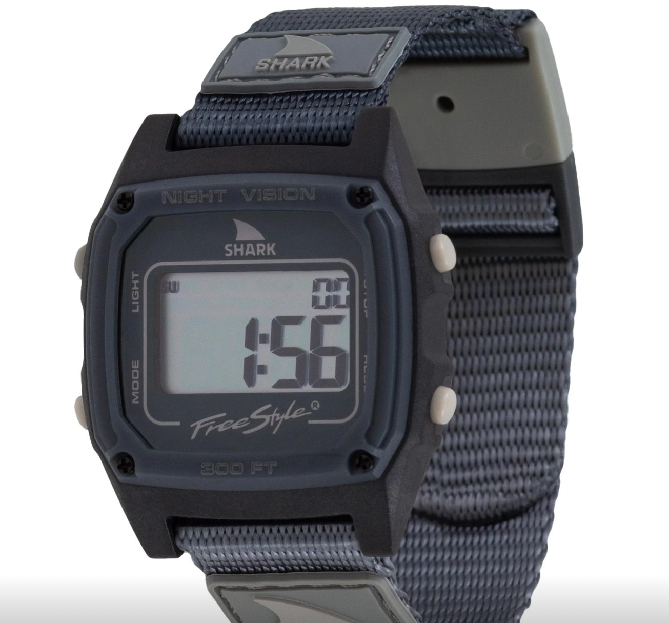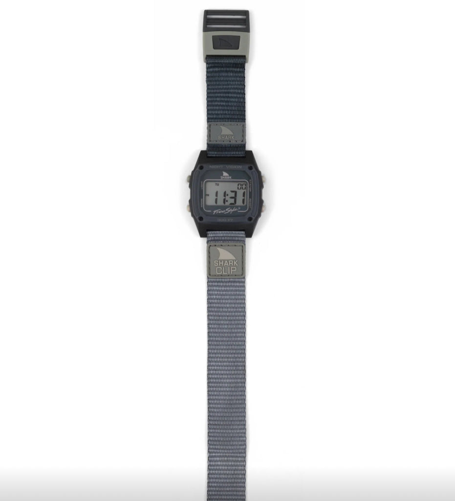 Shark Clip proudly showcases the iconic OG clip band system that turned Freestyle into a legend. Picture it like sliding into a comfy seatbelt – a simple clip and you're snug and secure. But don't be fooled by its rad appearance; this surf watch isn't just about style – it's loaded with all the digital must-haves: time, date, stopwatch, countdown timer, alarm, and even a night vision backlight. Plus, you've got the reassurance of our reliable limited lifetime warranty. Oh, and when you're catching those waves, no worries – it's water-resistant up to 100 meters deep. Surf's up!