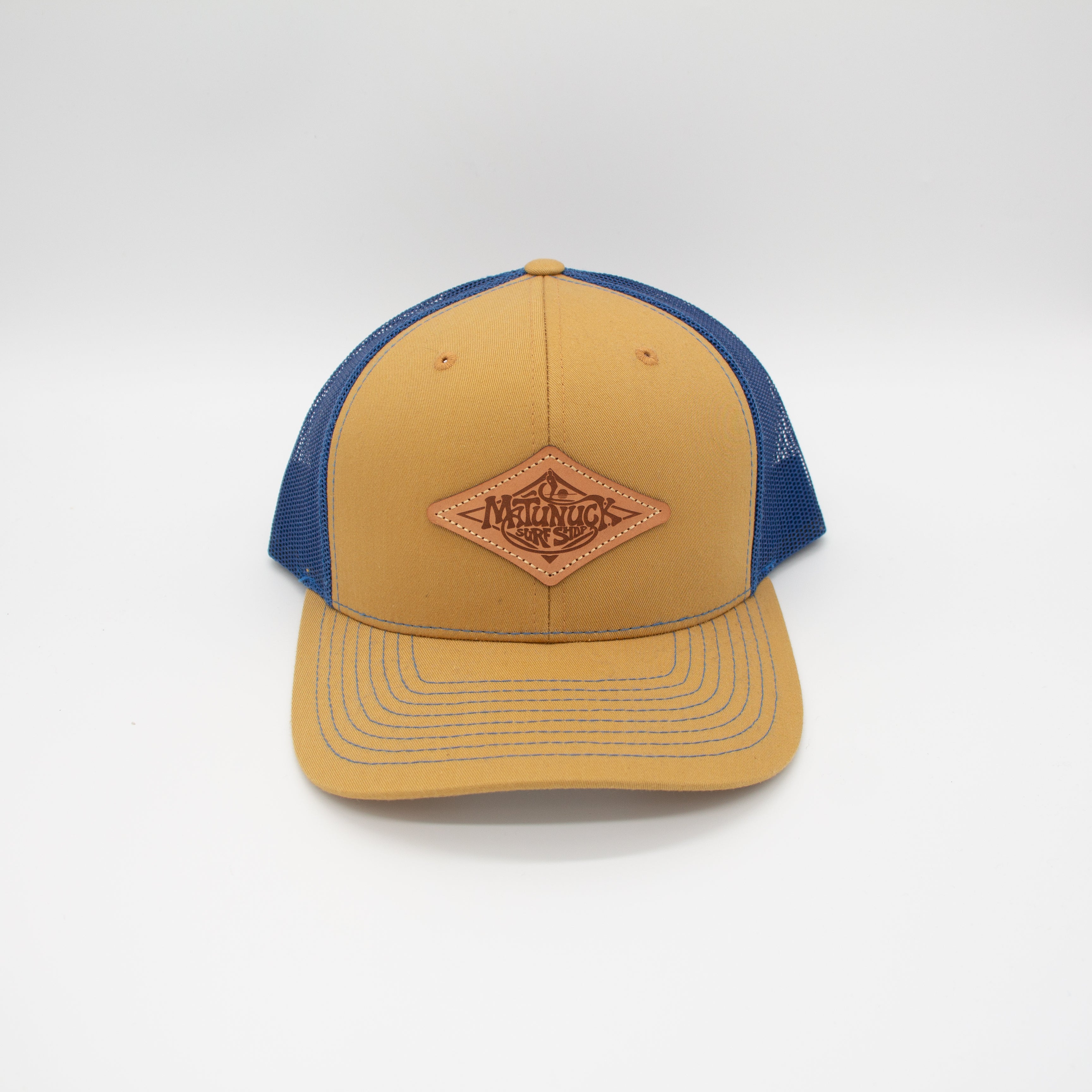 Leather Patch Trucker Hat - Camel/Blue