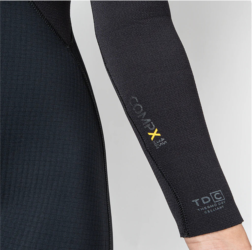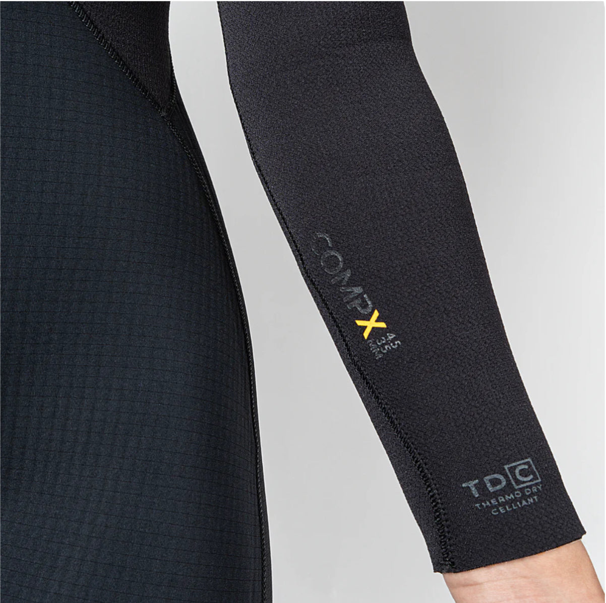 High Performance with TDC Infrared Warmth. Comp X falls in the top tier of the performance and warmth categories. It offers a light weight Channel Flex exterior which maximizes stretch, combined with our exclusive Thermo Dry Celliant (TDC) infrared interior that penetrates deeper into the body's core for added warmth. This suit also offers completely sealed seams, and 1 piece front and back panel design.