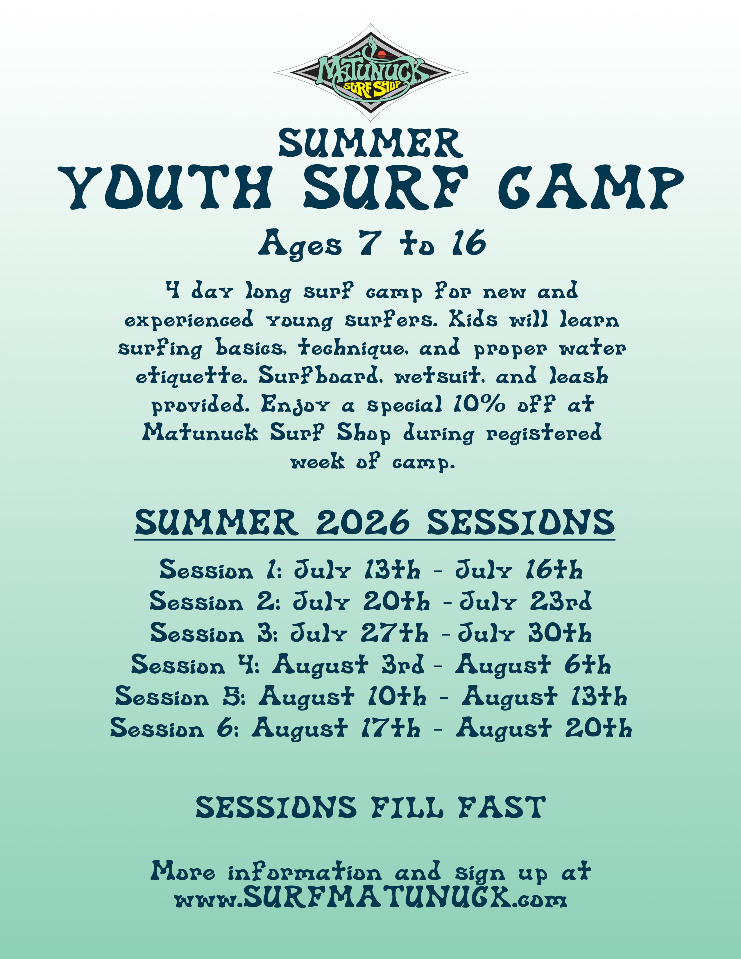 - Enjoy a special 10% off at Matunuck Surf Shop (effective during registered week of camp)